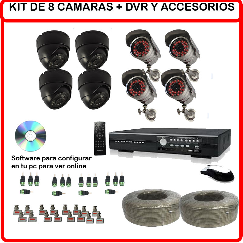 Kit de 8 Camaras de Seguridad + Gabador DVR ,Cable de 200 mts + 16 Conectores video, 16 Conectores e